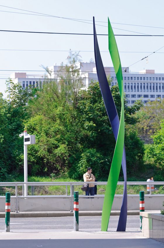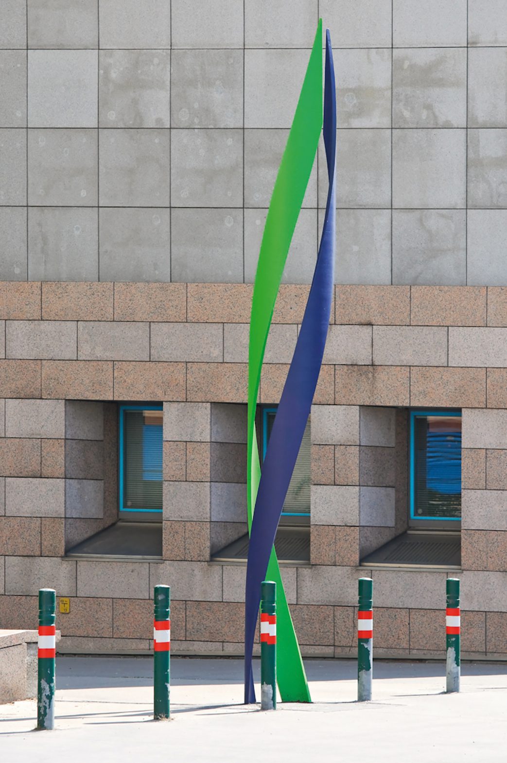 Mit dem Anspruch ein identitätstiftendes Orientierungssystem zu schaffen, positionierten wir an den Haupteingängen zum Areal jeweils eine elegant geschwungene, dabei streng geometrische Doppelhelix als dreidimensionales Markenzeichen. Durch die dynamische Form verändert sich ihre Gestalt je nach Blickwinkel und scheint immer in Bewegung zu sein. Abgeleitet von der Doppelhelix sind die Wegweiser: doppelte, geschwungene Stelen, jeweils gut zwei Meter hoch. Vor den Eingängen der Gebäude informieren einfache, schlanke Tafeln über die Institutionen.