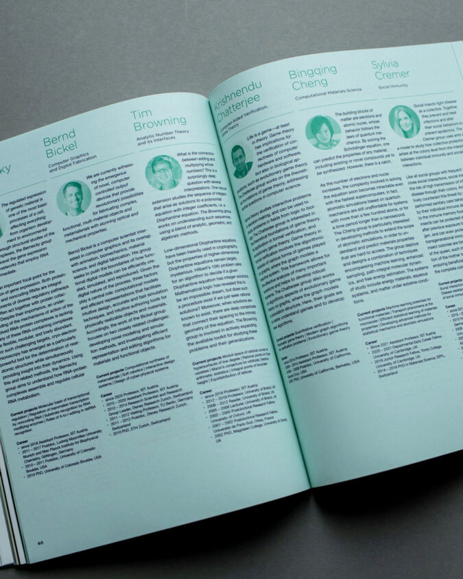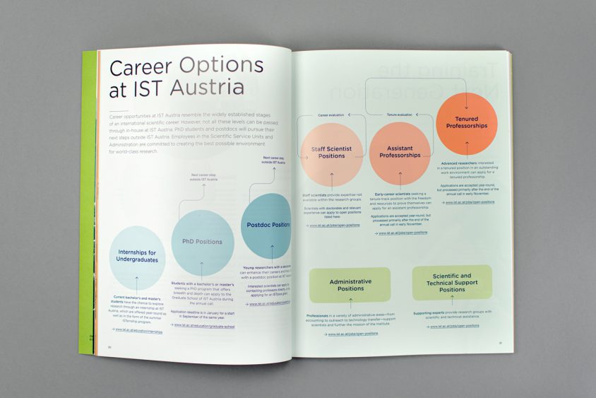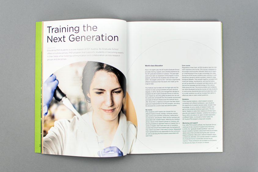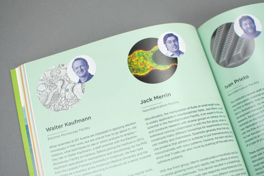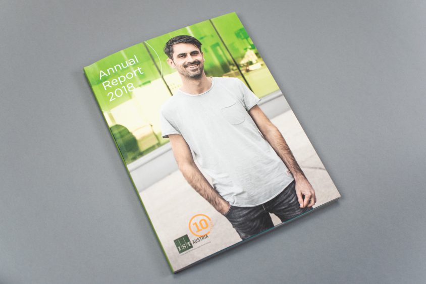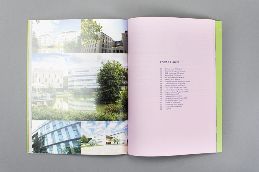 Am Institute for Science and Technology wird naturwissenschaftliche Grundlagenforschung auf höchstem Niveau betrieben. Um im Jahresbericht die Außenwelt an den Ergebnissen teilhaben zu lassen, haben wir das Layout in Form und Farbe mit Schwung und Leichtigkeit versehen. Der Imageteil ist auf einen Griff durch einen spürbaren Papierwechsel von den Zahlen und Fakten unterscheidbar.