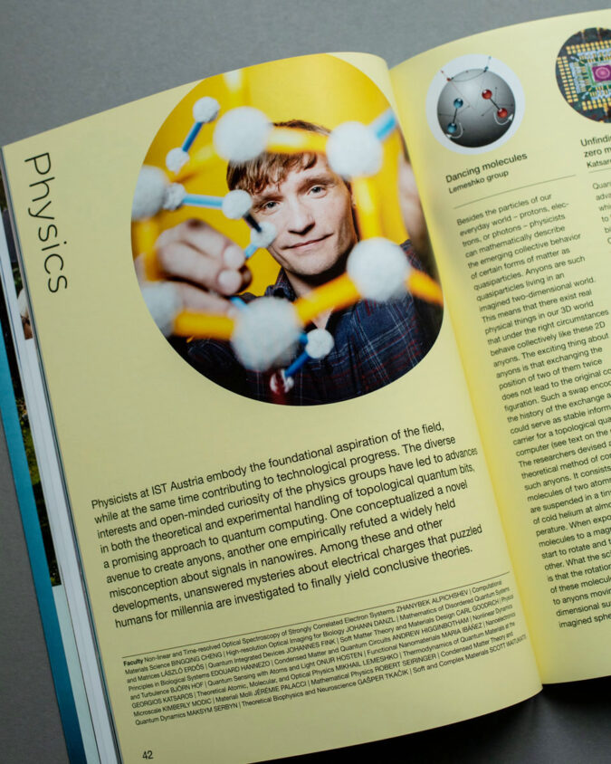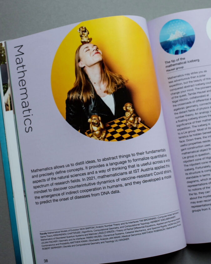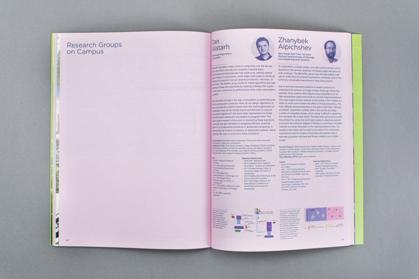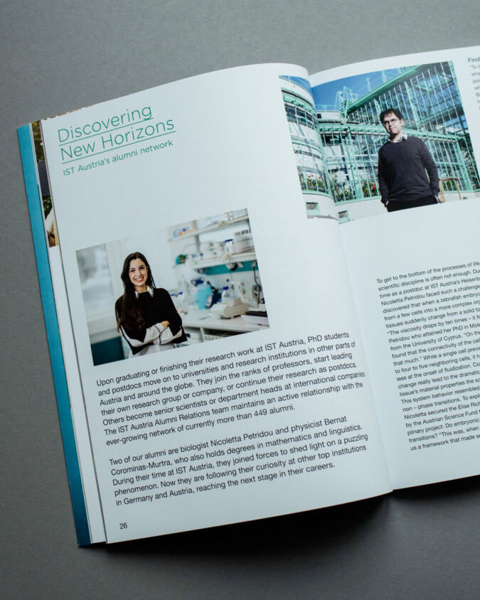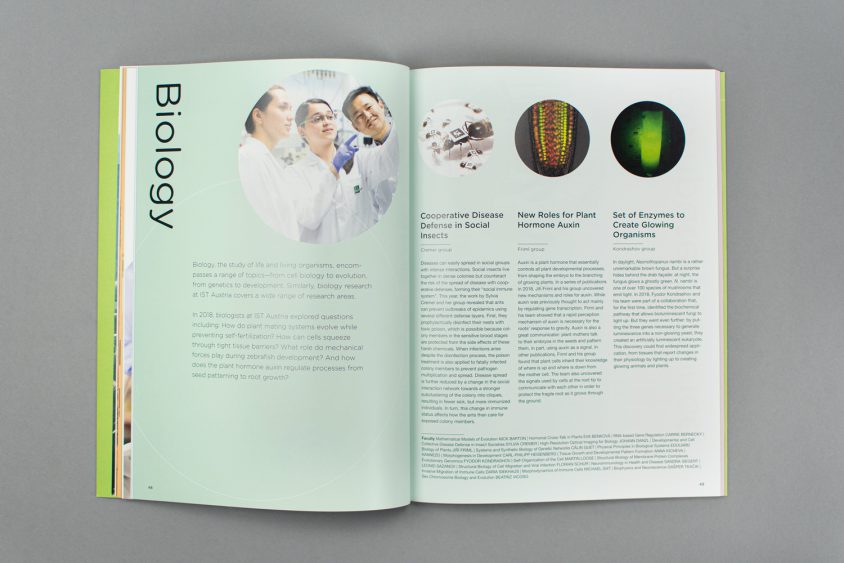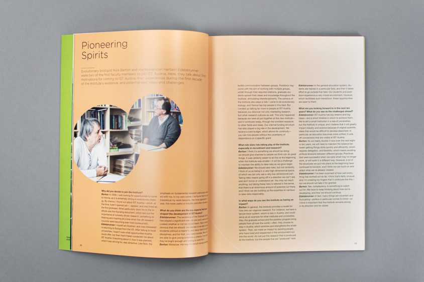 Am Institute for Science and Technology wird naturwissenschaftliche Grundlagenforschung auf höchstem Niveau betrieben. Um im Jahresbericht die Außenwelt an den Ergebnissen teilhaben zu lassen, haben wir das Layout in Form und Farbe mit Schwung und Leichtigkeit versehen. Der Imageteil ist auf einen Griff durch einen spürbaren Papierwechsel von den Zahlen und Fakten unterscheidbar.