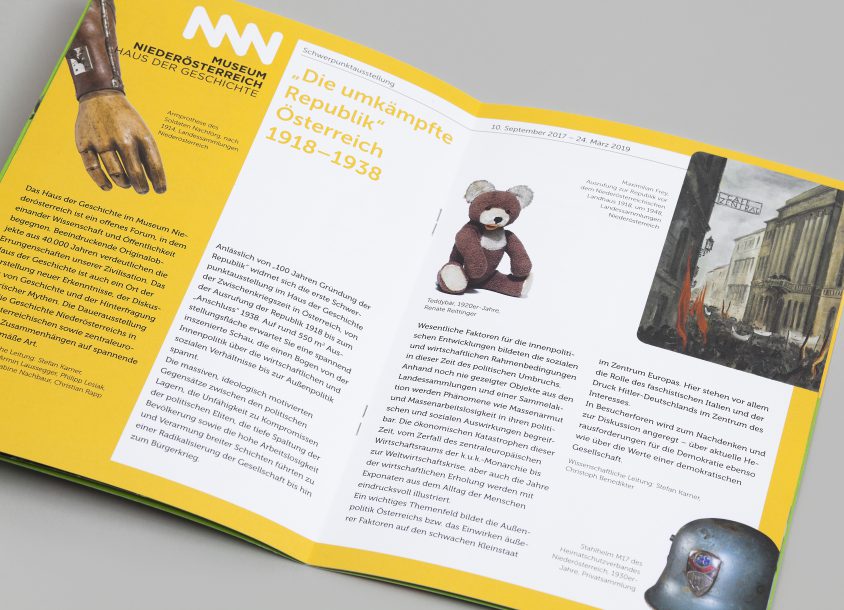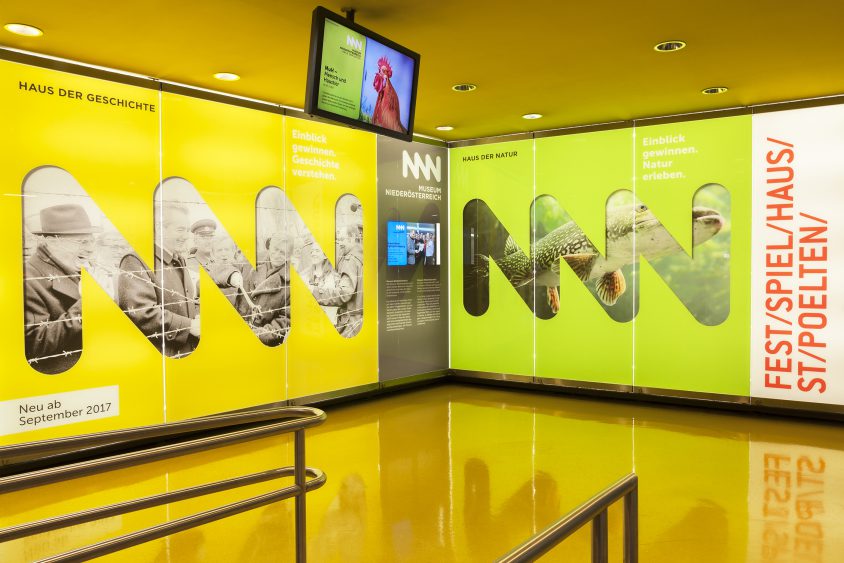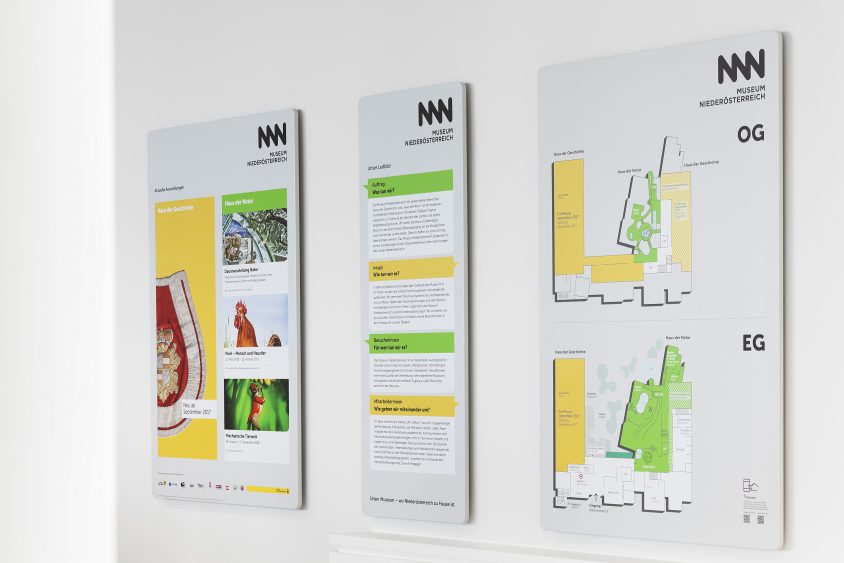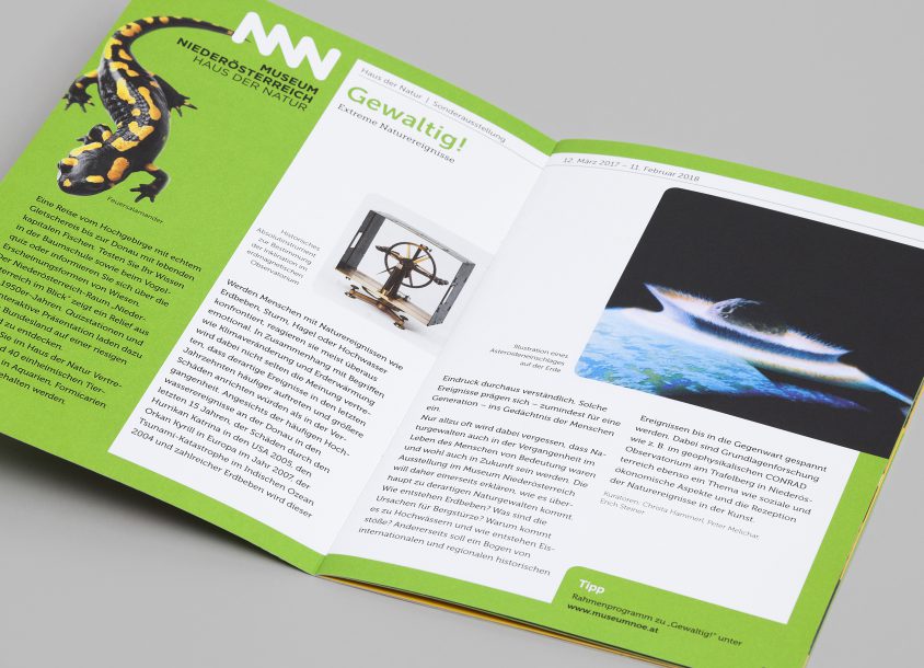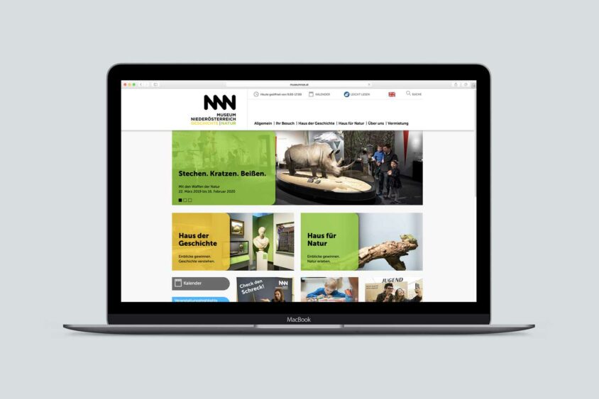 Das ehemaligen Landesmuseums NÖ hat nicht nur seinen Namen geändert, auch Corporate Design und Website bedurften einer Verjüngung. Inspiriert von der Zackensilhouette der Shed-Halle, haben wir aus den Initialen M und N ein Logo entwickelt. Die thematische Zweiteilung des Hauses in Natur und Geschichte haben wir in der gesamten visuellen Kommunikation farblich schnell erfassbar gemacht.
