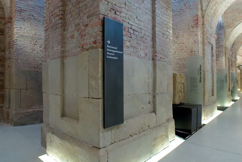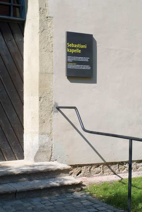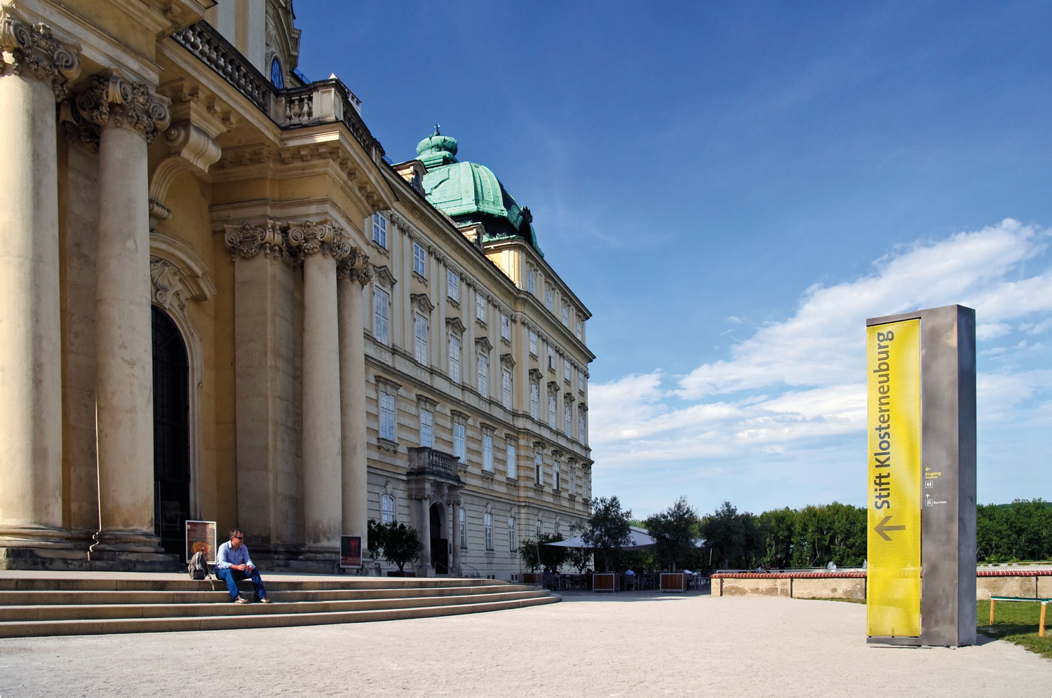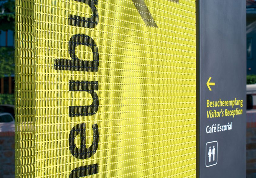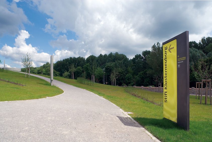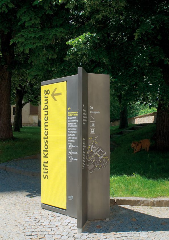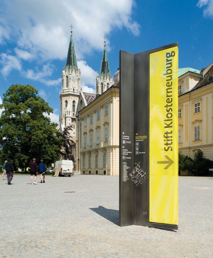 Für das Stift Klosterneuburg haben wir über ein Jahr an Gestaltung und Planung des Leitsystems gearbeitet. Der großzügigen barocken Architektur haben wir bewusst klare Formen und kühle Materialien entgegengesetzt. Markantestes Element sind zwei bzw. vier Meter hohe Stelen im Außenbereich, die der Orientierung dienen und gleichzeitig selbstbewusstes Zeichen sind. Wir wollten ein prägnantes Leitsystem, sichtbar und klar, aber dennoch mit einer gewissen Leichtigkeit. Die Stelen bestehen aus einer mattschwarzen Stahlklammer, in der ein leuchtend gelbes transparentes Stahlgewebe verspannt ist. Im Stift selbst führen dezente schwarze Stahlschilder die Besucher durch die neu gestalteten Räume.